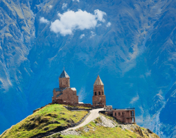Поднимемся на внедорожниках на высоту 2170 м, где у подножия Казбека, парит в облаках древний храм XIV века о котором так прекрасно написал А.С.Пушкин в своём стихотворении.